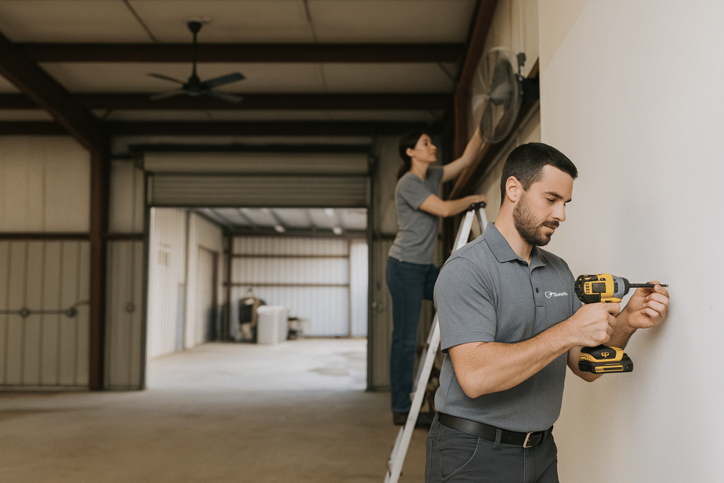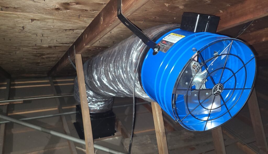 A high-powered house fan was installed inside the mechanic shop to improve air circulation and ventilation. This setup helps draw out exhaust fumes and reduce heat buildup, creating a safer and more comfortable working environment for the technicians. The fan effectively supports the overall airflow, especially during hot days or while engines are running indoors.