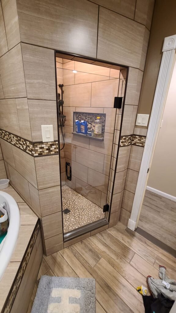 This bathroom remodel features a luxurious upgrade with the installation of a jacuzzi tub and a custom-built shower. The new layout combines relaxation and functionality, offering a spa-like experience at home. The custom shower includes modern tile work and premium fixtures, while the jacuzzi tub adds comfort and elegance—transforming the space into a serene retreat.