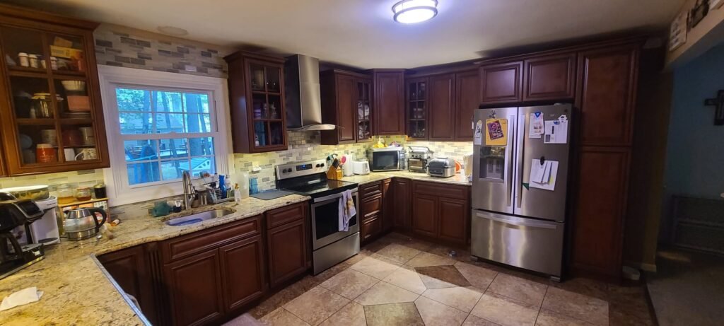 This kitchen remodel opened up the space by removing an unused back door and converting a full dividing wall into a half wall. The changes improved the flow between rooms and allowed more natural light to fill the space, creating a brighter and more connected layout. The updated design enhances both functionality and visual appeal, making the kitchen feel larger and more inviting.